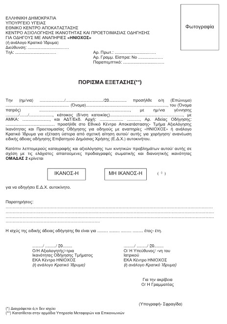 2. Για την ιατρική εξέταση από το Εθνικό Κέντρο Αποκατάστασης Κέντρο Αξιολόγησης Ικανότητας και Προετοιμασίας Οδήγησης για οδηγούς με αναπηρίες «ΗΝΙΟΧΟΣ» του Υπουργείου Υγείας ή οποιοδήποτε ισότιμο κρατικό ίδρυμα ενδιαφερομένου για απόκτηση ή ανανέωση ειδικής άδειας Ε.Δ.Χ. αυτοκινήτου ο οποίος παρουσιάζει κινητικά προβλήματα, απαιτείται η προσκόμιση των δικαιολογητικών της υποενότητας 2.3 του Κεφαλαίου Α΄ του Παραρτήματος III του π.δ. 51/2012.