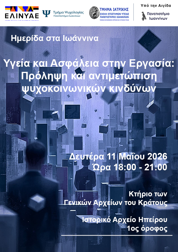 Το ΕΛ.ΙΝ.Υ.Α.Ε. σε συνεργασία με το Τμήμα Ψυχολογίας και το Τμήμα Ιατρικής του Πανεπιστημίου Ιωαννίνων διοργανώνουν εκδήλωση με θέμα "Υγεία και Ασφάλεια στην Εργασία: πρόληψη και αντιμετώπιση ψυχοκοινωνικών κινδύνων".