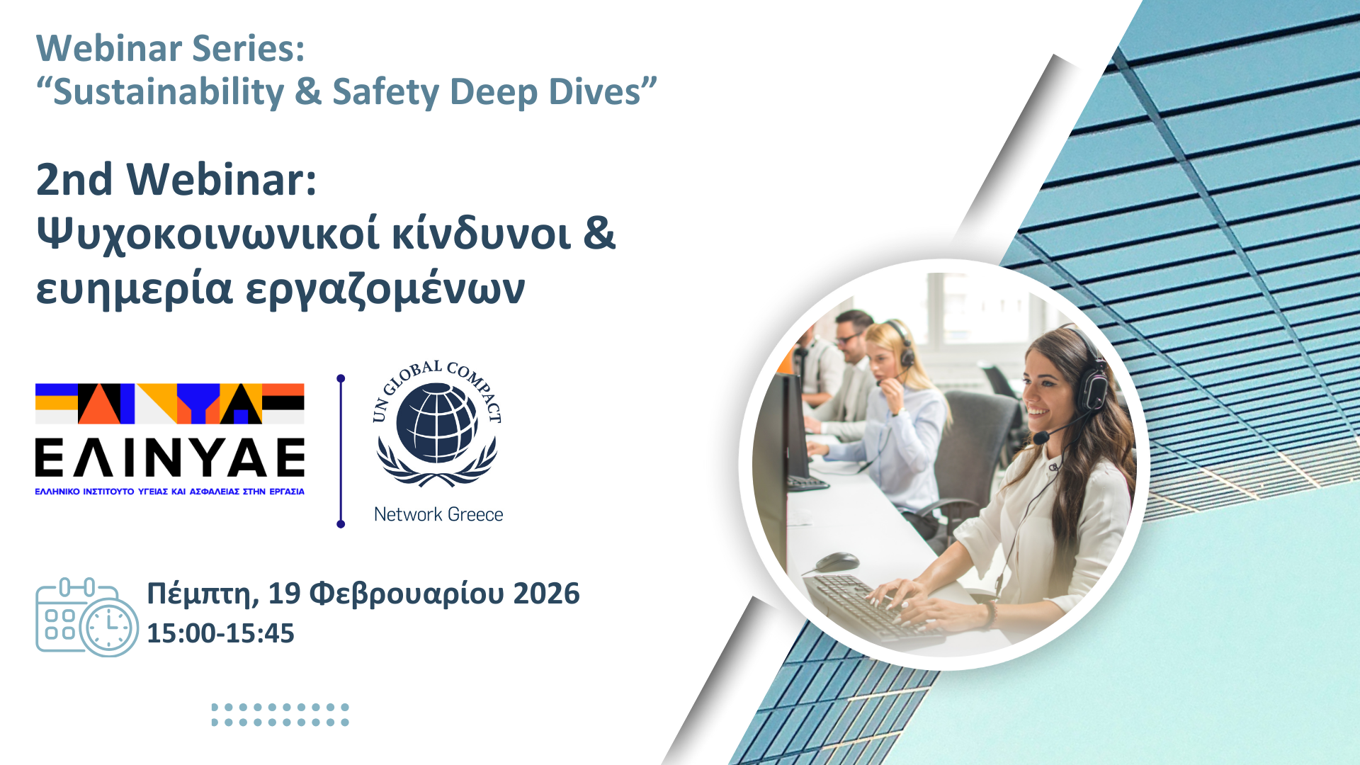 Το ΕΛ.ΙΝ.Υ.Α.Ε. και το UN Global Comapct Greece στο πλαίσιο της συνεργασίας τους διοργανώνουν τη 2η διαδικτυακή εκδήλωση (webinar) με θέμα: Ψυχοκοινωνικοί κίνδυνοι και ευημερία εργαζομένων.